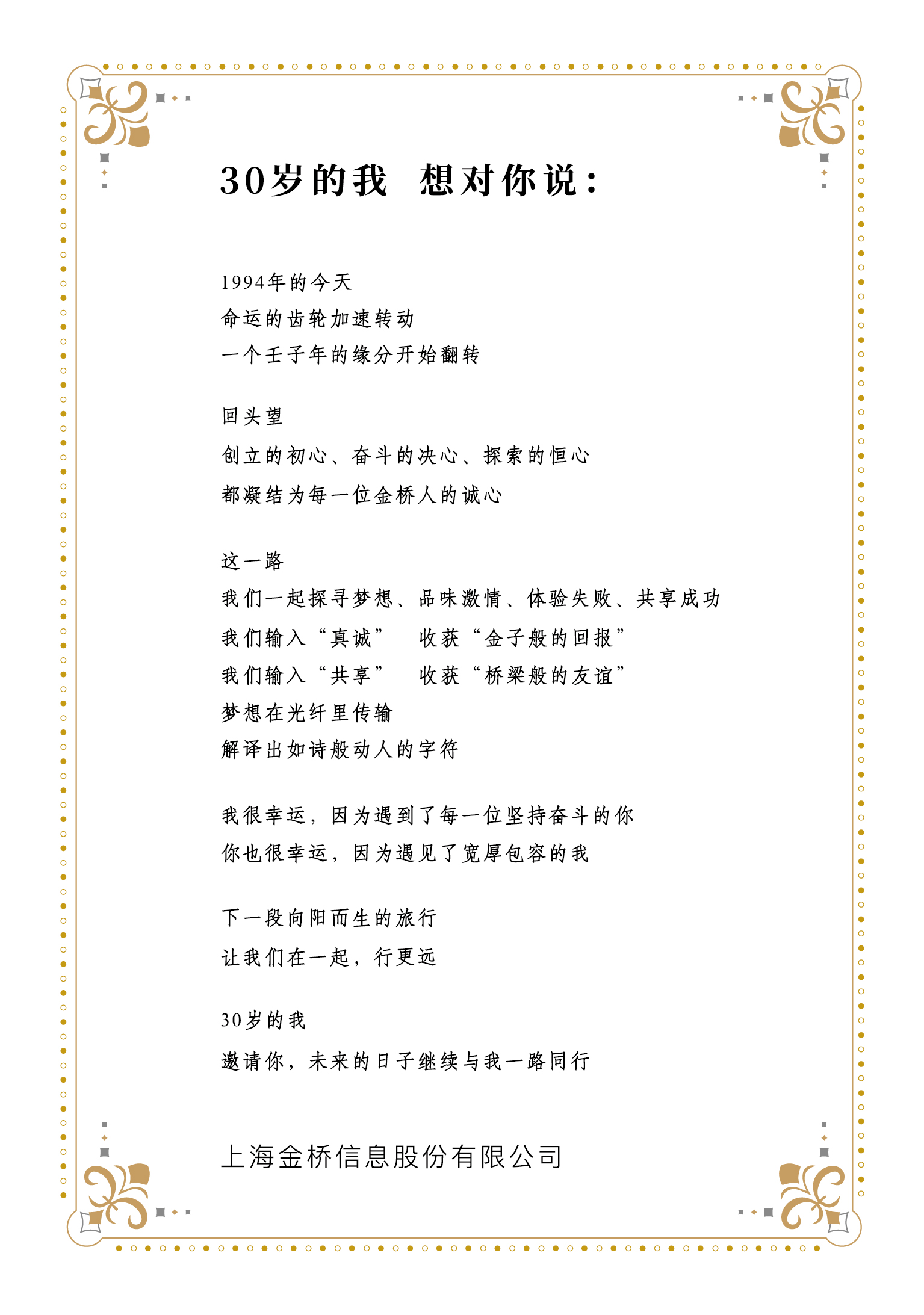 2024年5月16~18日,“在一起,行更遠”金橋信息30周年慶典活動(dòng)于莫干山開(kāi)元森泊度假酒店盛大舉行!本次慶典為期三天,除了恢弘盛大的慶典晚宴,還有激情四射的草坪 LIVE SHOW 團建,好吃、好喝、好玩的全部配齊!天南海北的金橋人歡聚一堂,朝著(zhù)同一個(gè)圓心匯聚,點(diǎn)燃生日的蠟燭,舉起歡慶的酒杯,為我們最最深?lèi)?ài)的金橋送上生日祝福!而立金橋,生日快樂(lè )~~~