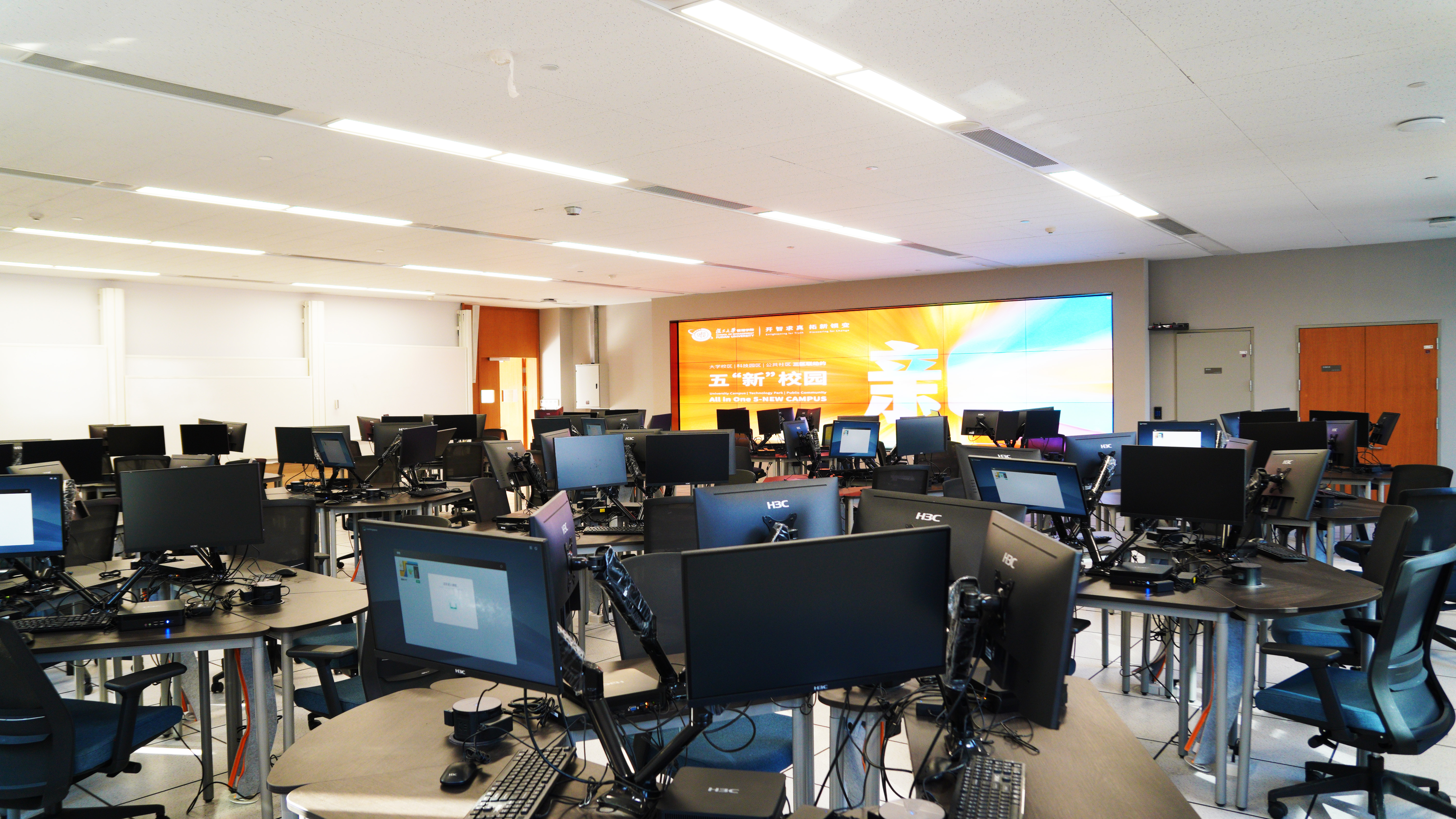 本項目位于楊浦區五角場(chǎng)商圈,總建筑面積約50000平方米,金橋信息為復旦管院新校區打造了各類(lèi)教室、報告廳、實(shí)驗室及專(zhuān)業(yè)劇院等多功能教學(xué)空間100+間。全新的智慧教室徹底打破了物理空間的傳統壁壘,實(shí)現了革命性的全域音視頻互聯(lián)互通。